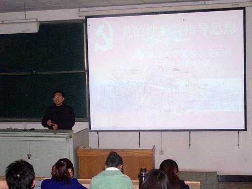 我院邀请到我校党委宣传部相关负责人担任此次党校培训第二讲的主讲。整个培训,他从政治、政党及党的阶级性和先进性三方面表述了中国共产党的性质。培训中,他从古至今由国外到国内,深入浅出地为大家讲解了党的相关知识。另外,他还说到,党的领导是中国特色社会主义事业取得胜利的根本保证。精彩的讲解得到同学们的阵阵掌声。