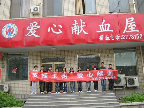 青海玉树地震的灾情牵动着我们每个人的心。近日,我院通过不同的方式,表达着对灾区人民的关心和关注。4月25日上午,我院爱心家园社团来到淄博市中心血站的爱心献血屋,组织同学们进行了“支援玉树,爱心献血”的献血活动,用这样的方式表达我们对受灾群众的关爱之情。