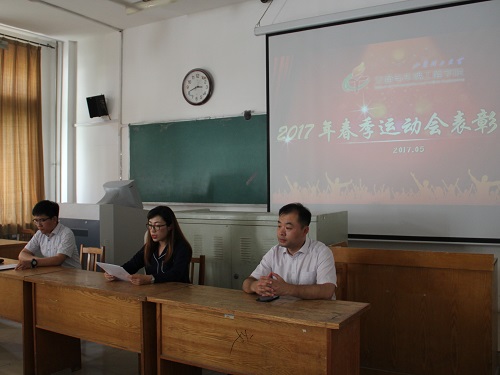为表彰我院在春季运动会期间表现优异的运动员及工作人员,激励学生积极参与体育锻炼,5月18日下午,我院在12号教学楼211教室举行了“2017年春季运动会表彰大会”,团总支书记、学生科科长戴洁,辅导员高萌、国睿,部分运动员以及学生会相关工作人员参与了此次大会。大会由国睿主持。
