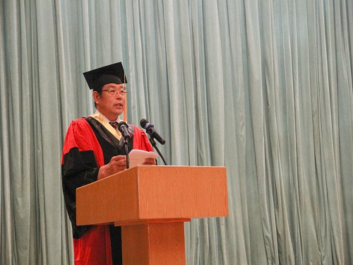 仪式进行第一项,高松院长进行致辞,他首先祝贺全体毕业生顺利毕业,并对毕业生们所取得的成就进行了赞扬。他向全体学生讲述了“厚德,博学,笃行,至善”的校训,并深度剖析了其中的含义,希望全体学生能够在社会上发扬落实。接着他送给了毕业生们四句话:有思路才有出路,有创新才能有发展,有团队才有力量,有作为才有地位。高松对毕业生们讲到,毕业不是终点,而是人生的另一个起点,毕业生进入社会后,要懂得学以致用,要将大学里的创新、求知精神应用到实践中去,要懂得与他人合作,在不断地学习中提升自我,为社会创造更多的价值。他满怀希望的发言让毕业生受益颇深,最后,高松在热烈的掌声中结束了致辞。