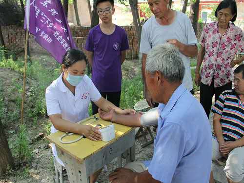支医活动时,实践团成员请到当地宏大医院一名护士协助进行简单的血压脉搏测量等项目,对村中老人进行免费检查,并针对测量结果,给出建议,同时,一名支教团成员在村中解说基本的医疗保健知识,增强此次支医活动的效果。