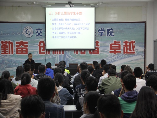 王建兴首先从学生干部的身份,作用,条件,现状以及做学生干部的原因五个方面进行简单讲解。他认为学生干部起到桥梁与纽带,骨干与表率,服务员与管理者,老师的得力助手,学校的重要培养对象和依靠力量的作用,还通过工作热情和能力等方面提出现在学生干部发展参差不齐的现状。紧接着他就如何做好学生干部进行深度解读。通过列举党的领导机构、领导核心,人民代表大会,中国人民政治协商会议,行政级别,军队职务,各种场合的座次以及打电话的注意事项等,总结出学生干部需要锻炼的几种能力,并就计划能力、判断能力、决策能力、执行能力给出详细意见。做一个优秀的学生干部仅仅这些是远远不够的,除此之外,他还提到需要拥有学习、协调、亲和、成长等能力及应该掌握一些工作技巧,并重点提示作为一名合格的学生干部,应是从同学中来,到同学中去。为使同学们能更加深入的认识到学生干部的使命感和重要性,王建兴还列举了自己曾经带过的优秀学生干部的工作作风和事迹来鼓励在的在座成员。整个培训过程中,王建兴以幽默风趣的语言深深吸引了全体成员的注意力,同学们认真的做笔记,使培训会达到了事半功倍的效果。