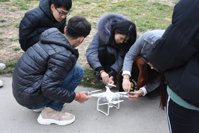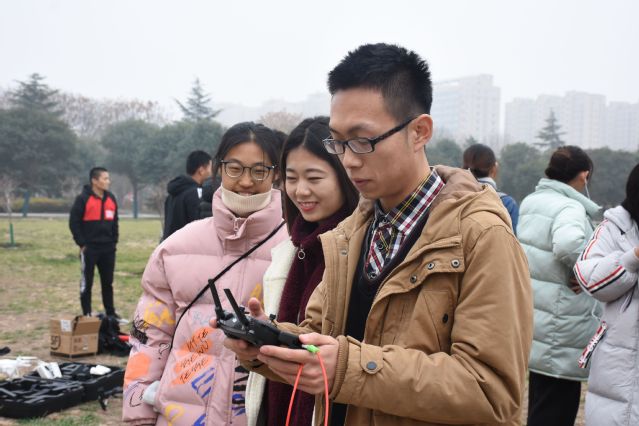 活动分为五个小组,每组分配有一到两名飞手进行教学指导和安全监管。同学们簇拥在飞手周围,学习无人机的基本飞行操作,并在飞手指导下轮流操作。此次活动,创飞公益社共配备八台飞行设备和VR眼镜,让大家可以领略俯瞰校园美景的上帝视角,进一步加深了成员们对无人机相关设备的了解。