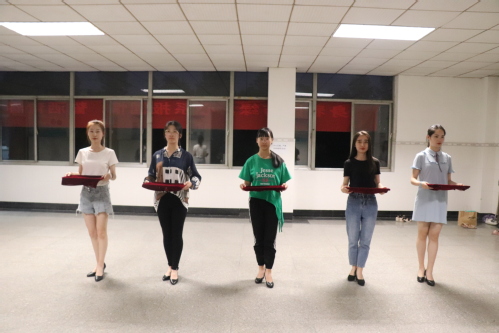 此次培训内容包括基本礼仪、接待礼仪、引导礼仪和颁奖礼仪四个部分。培训开始前,队员进行准备活动,就鞋子问题进行了一些调整。准备完毕后,培训正式开始。王紫嫣首先对队员们进行了站姿训练,包括对礼仪手位动作的讲解。训练过程中,王紫嫣对参训对人员进行一对一指导,亲身示范,纠正错误,让其理解深刻,充分掌握各种礼仪技巧。随后,王紫嫣借助托盘等工具对参训人员进行训练,讲解如何正确用手托托盘,同时也说明了使用托盘时的注意事项,要求大家在走路平稳的同时保证托盘的稳定。