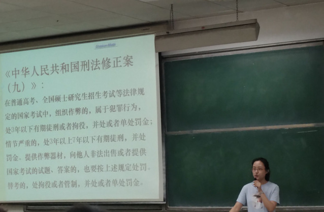 主题班会由一段考试作弊警示教育短片开始,短片中一个个触目惊心的案例让学生意识到参与国家考试作弊对社会、对自身的严重危害性和高度危险性。短片结束,周燕燕通过ppt带领大家学习与考试作弊相关的国家法律和学校制度,明确要求大家坚决拒绝替考,拒绝参与线上线下作弊答题,遵守考试纪律,自觉抵制违纪作弊行为。