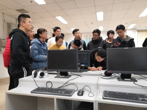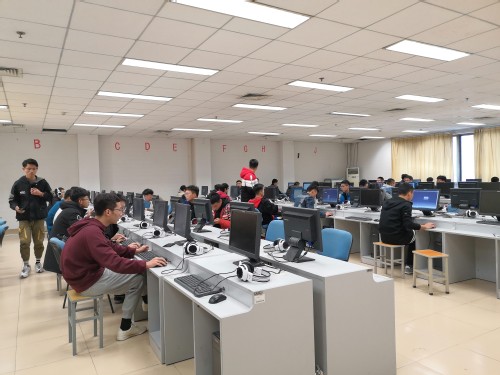 首先,考生们早早地来到信息楼,在签到表上选择好自己心仪的组别,并签上自己的名字。入场后,考生找好自己的位置,打开电脑,熟悉考场环境,等待考试开始。