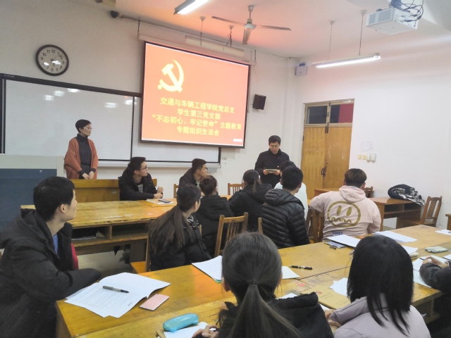根据学院“不忘初心、牢记使命”主题教育工作安排,12月10日下午,交通学院学生第三党支部于12教208室召开专题组织生活会,学院党总支专职组织员丁德榜到会指导,学生第三党支部全体成员参加。会议由党支部书记侯娟主持。