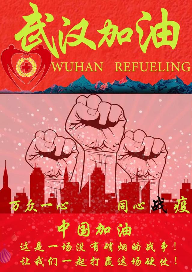海报由Photoshop制作,左上角是红十字精神标志,中间三个拳头代表万众一心,众志成城,同心战“疫”;中上方群山代表祖国人民一起努力托起大好河山,背景立体的红色颗粒代表美好生活即将到来,突出字眼武汉加油,中国加油。