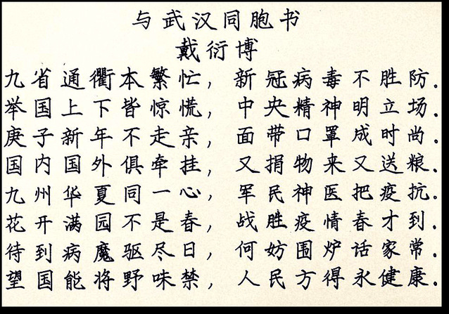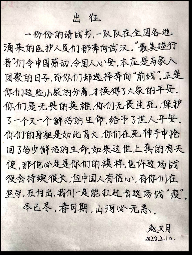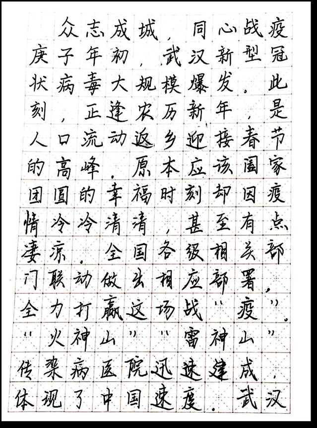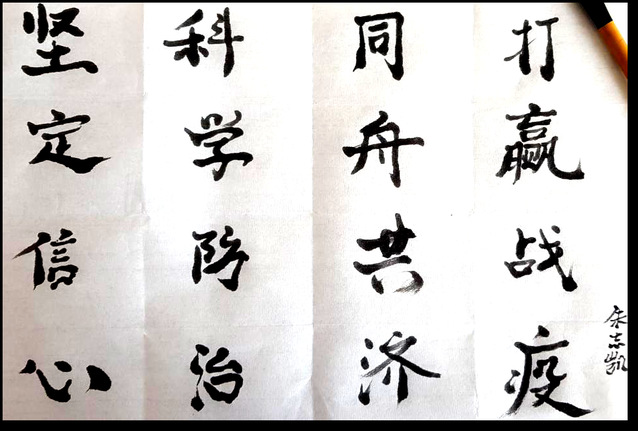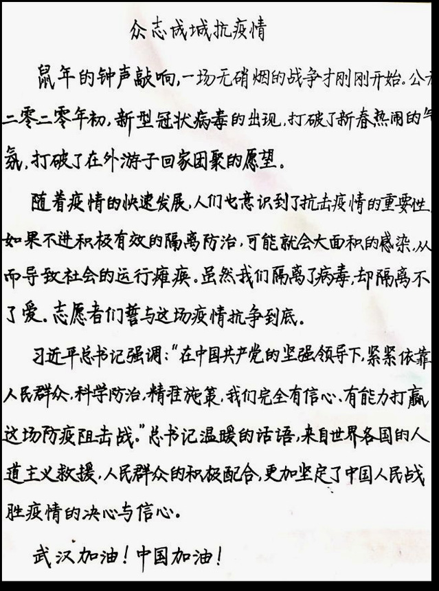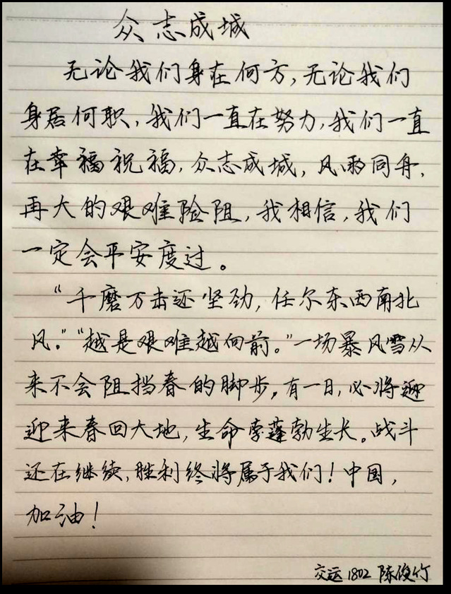 此次线上书法比赛面向我院17、18、19级同学,同学们踊跃报名参加。在此次比赛中,同学们纷纷表达自己对于抗击疫情的态度,为打赢这场疫情防控战贡献自己的力量。不论是用毛笔、钢笔还是中性笔,字里行间都可以看出同学满怀的激情与热血和与子同袍、同心战“疫”的决心。本次比赛共收到76件作品,经过评选,最终评选一等奖3名,二等奖5名,三等奖7名。以下是部分获奖作品: