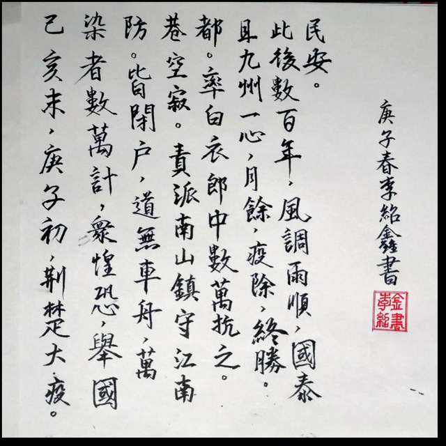 通过本次书法比赛,我院同学对于抗击疫情有了更深刻的认识,学会感恩生命,同时向疫情中所有的最美逆行者致敬。这一刻,没有被禁锢的城,只有离不开的爱,我们相信总会有一天,疾病肆虐过的冰冷土地下,是即将破土而出的春天!
