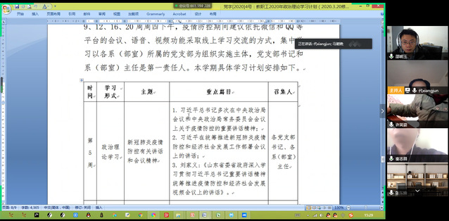 教工第一、二、三、四党支部,学生第一、二、三党支部,研究生党支部共260余名师生党员以“学习新冠肺炎疫情防控有关讲话和会议精神”为主要内容开展了线上学习交流活动。全体党员集体学习了习近平总书记关于新冠肺炎疫情防控工作的重要指示和讲话精神以及山东省统筹推进疫情防控和经济社会发展视频会议上的讲话精神,并于会后积极交流发言。
