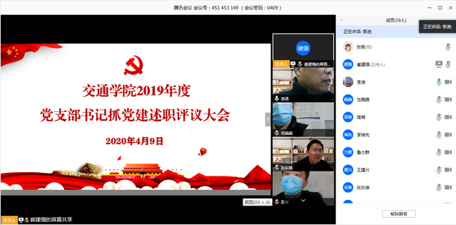 4月9日上午,williamhill威廉希尔党总支通过线上会议的形式召开2019年度党支部书记抓党建述职评议会。学院领导班子成员,党总支委员,各党支部书记参加,评议会由学院党总支副书记王建兴主持。