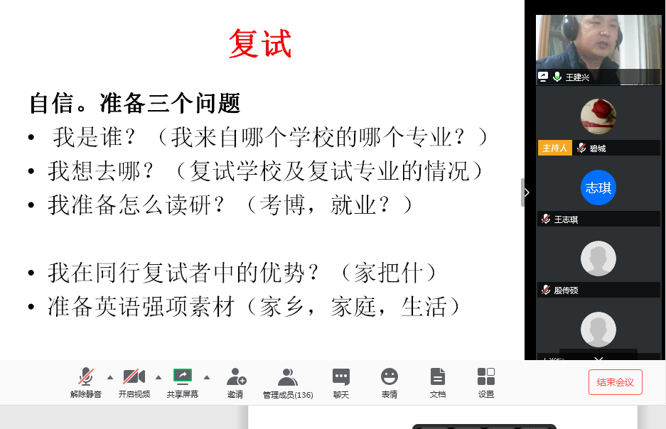 本次线上交流会的召开为我院考研学子在复试的关键环节提供了指导、指明了方向、鼓舞了士气,有助于同学们坚定信心、调整心态、科学合理的准备复试与调剂。学院将继续抓好考研精准指导、服务工作,全面助推我院考研学生实现深造梦想!