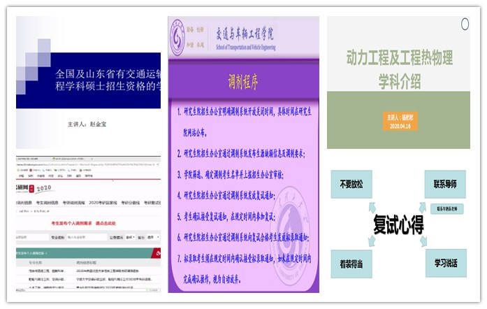 交通运输系教师赵金宝、交通工程系副教授郭栋、能源与动力系教师杨彬彬、车辆工程系教师付宏勋4位老师分别进行了讲解。赵金宝主要讲解了省内外交通运输专业有硕士招生资格的院校的招生资格、学科实力、调剂难度,避免毕业生在调节剂过程中踩雷。郭栋叮嘱考研学生要在复试过程中着重体现自身的创新能力,建议毕业生可以从学术生涯规划的角度考虑跨学科调剂,拓展专业调剂的维度。杨彬彬从学科概况、研究方向、师资队伍、科研条件、人才培养5个方面系统介绍了我院动力工程级工程热物理的学科情况,并欢迎考生积极调剂本校。付宏勋从当前考研分数段入手,分别给予了毕业生中肯的建议,并具体讲解了复试备考、面试过程中的注意事项。