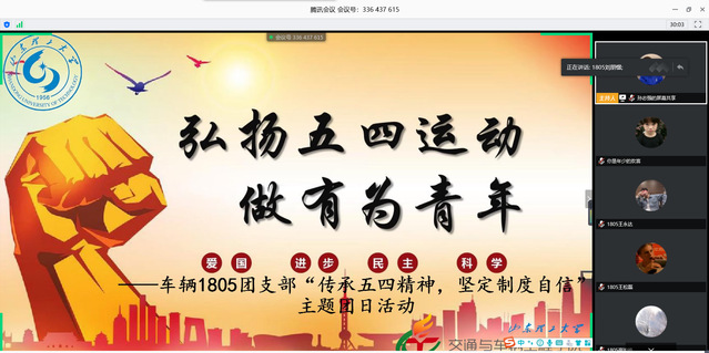 活动伊始,团支部全体成员观看主题为“让青春为祖国绽放”的活动视频, 大家积极参与其中,认真观看,并在其过程中记录自己的感受。紧接着,班级成员积极参与共青团中央的系列活动,由较强的参与感。其次,团支部召开“五四精神”分享会,同学们根据对五四精神的理解结合自身的实际经历,表达并分享自己的想法与感悟。有同学说到,少年强则中国强、少年富则中国福,中国发展的接力棒已经传在我们手里,我们要努力奋斗,发扬不怕吃苦不怕累的精神,用青春为祖国做贡献。活动最后,孙志强对团支部近期的青年大学习和学习强国情况进行了详细总结。