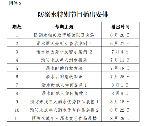 山东省学校安全研究与教育基地、山东教育电视台现已制作《同心防溺水特别节目》,山东教育卫视每周六晚 19:32 播放(播出安排见附件 2),或者通过扫描“安全学习在线”二维码(附件 1),进入微信公众号“安全学习在线”,在“同心防溺水”中打开“防溺水特别节目”观看。节目内容涉及《中华人民共和国安全生产法》《山东省学校安全条例》等相关法律法规的解读、防溺水自护知识专家讲座、各地各校先进经验或工作亮点展示和分享、溺水现场救援警示系列片及互动答题等。请各团支部认真组织收看,营造浓厚防溺水宣传教育氛围,推进防溺水工作入脑、入心。