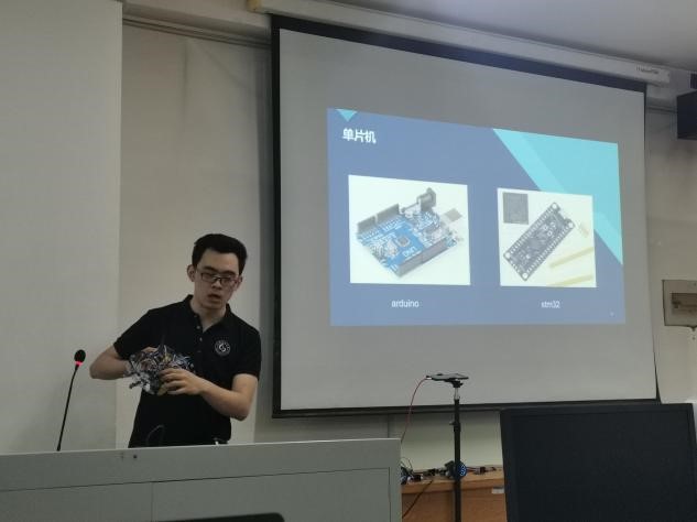然后便由李光锐上台进行经验分享,他除了对郭浩所指导内容进行了补充,还将自己的参赛经验告诉同学们,同时他用自己制作的智能车与郭浩制作的智能车进行比较,让成员们深刻理解不同组装部件以及不同组装方式所带来的差异,台下成员们深有体会。