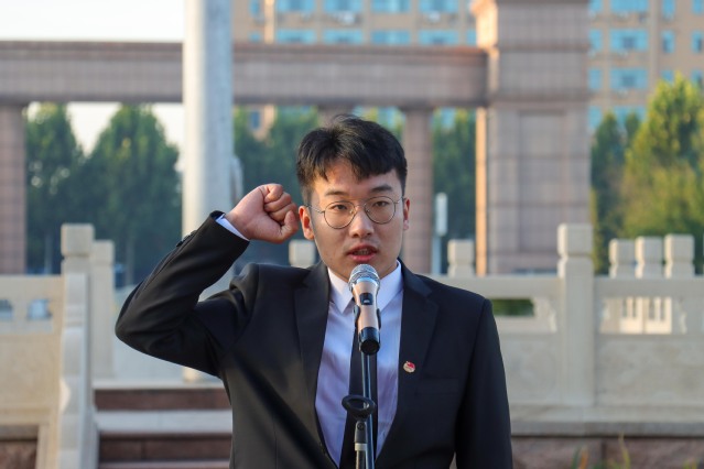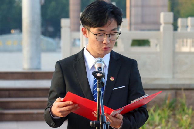 学院学生会主席团成员、交工1801班孙光辉带领全体学生面向国旗庄严宣誓,重温入团誓词。