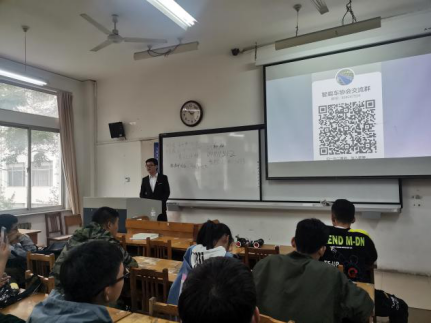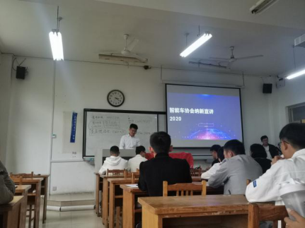 宣讲开始,主讲人首先介绍了智能车协会的背景与发展,以让新同学更好的了解智能车协会。接着,又介绍了智能车协会近几年获得的荣誉以及几位优秀学长的成就,并对智能车协会参加的赛事进行了简要介绍,并说明如果想要参加比赛,协会会提供优质的培训与赛道练习来支持协会成员们,这极大的吸引了台下新生极大的兴趣。最后,主讲人向2020级新生表示,只要他们有参加的想法并且愿意为智能车协会的发展与竞赛付出努力,智能车协会绝不会辜负他们。