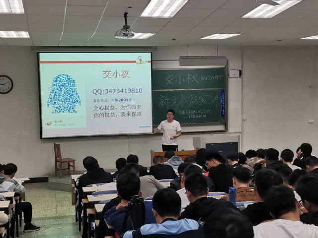 其次,由主讲人详细介绍了本学院权益方面的工作、讲解我院官方维权公众号“交小权”的相关功能以及在校园中常见的其他问题处理方法,如校外兼职、宿舍推销等。最后提醒新生在日常的校园生活中,要树立正确的价值观,提高维权意识,提高自我保护意识,切勿轻易相信他人,当自己的权益受到影响时要敢于通过正当渠道来维护自己的权益。