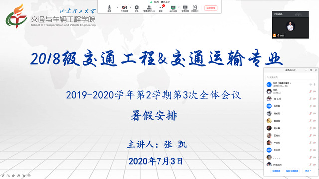 7月3日,学院2018级交工、交运专业通过腾讯会议召开线上班会,总结大二下学期工作,安排部署暑假有关工作。辅导员张凯主持会议,2018级交工、交运专业全体学生参加会议。