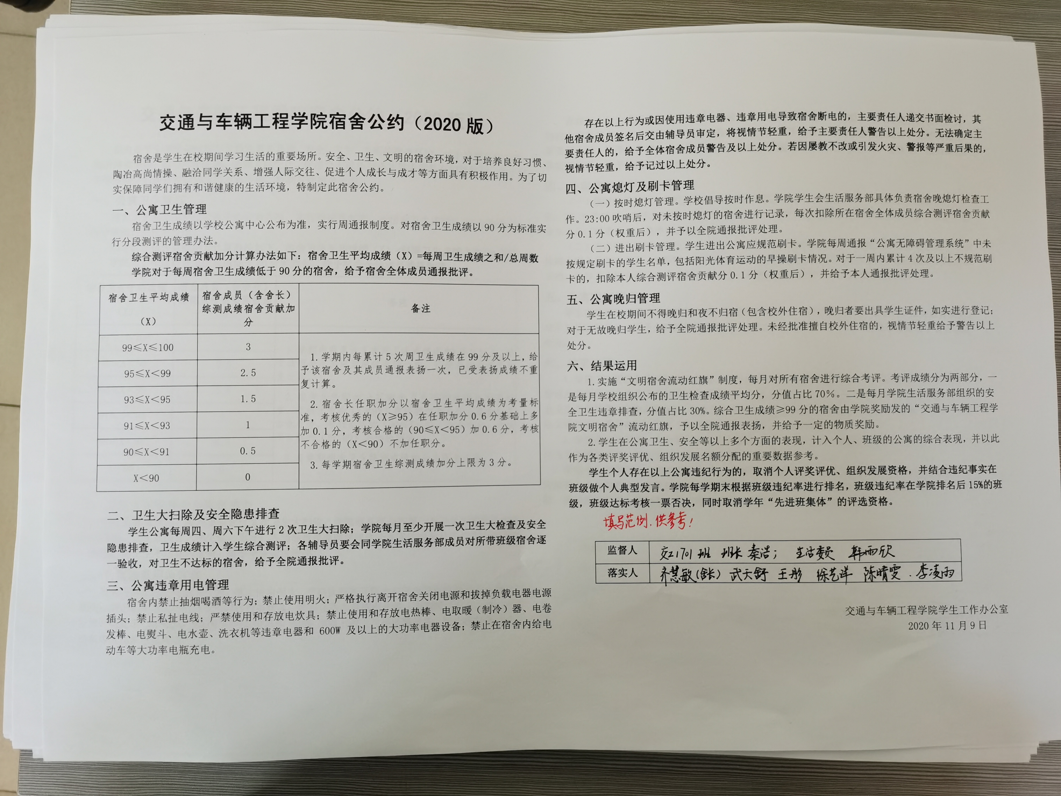 为了切实保障同学们拥有和谐健康的生活环境,11月11日到15日,学院依托最新版的宿舍管理规定,制定并印制了2020年最新版的“宿舍公约”,组织全院共计426个宿舍全部签订并张贴完毕。