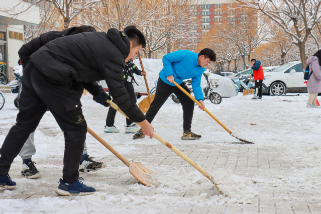 尽管寒风凛冽,积雪厚重,而且路面上的积雪都已结冰,增加了扫雪除冰的难度,同学们除雪的热情却分毫未减。学生干部和预备党员以身作则、身先士卒,将积雪铲至树根和道路两旁,并简单清理了共享单车上的积雪。大家配合默契,教学楼前的坚冰积雪逐渐被清理干净,露出了大理石瓷砖。半个多小时的扫雪活动中,同学们个个干劲十足,浑然不在意落在身上的雪花与冻得通红的双手和脸颊,大家躬着身子,铁锹,木铲、扫帚、铁锹、铁铲齐上阵,挥锹、破冰、铲雪、清地。