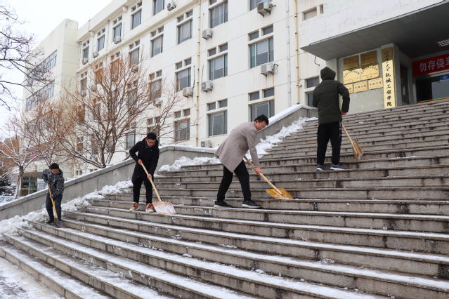 同学们首先在12号教学楼201教室集合,随后去13号教学楼领取工具。简单分配任务后同学们便前往机械交通实验楼及12号教学楼清理积雪。