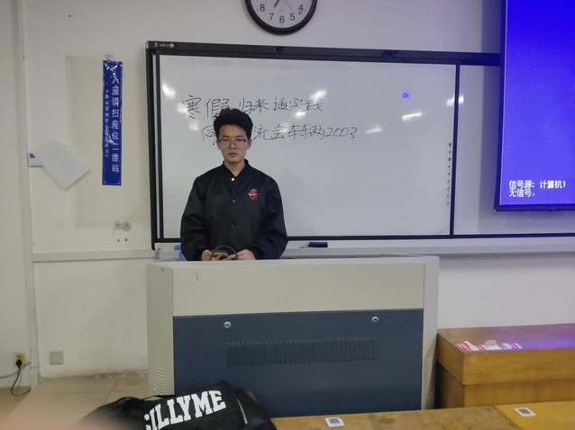接着,江新浙上台讲述了假期的暖冬志愿服务活动,该活动由江新浙组织发起,于菏泽开展。活动中,消防知识宣传、交通知识宣传、法律知识宣传等知识宣传活动和义务送春联、义卖、义诊等义务服务项目,吸引了过往市民观看咨询。医务人员为市民检查了身体,还介绍了一些日常养生的小妙招。活动中,江新浙向市民发放宣传资料,讲解了疫情防控的相关知识。随后,吴昌莹上台分享了她在江西赣县参加制作黄元米果的经历,讲述了她在工作中遇到的米粒浪费问题,分享了制作过程中如何避免烫伤的小技巧。她不仅仅学到了黄元米果的制作方法,还亲身体验到了工作的难处,明白了金钱来之不易。最后,石梁毅同学上台讲述了他在德州禹城参观松果新能源公司的经历,通过参观,石梁毅了解到松果及其海外子公司组建了超过600人的全球研发团队,汇聚来自德国、美国、韩国等世界知名汽车及零部件研发、生产、制造企业的专业技术精英,该团队具备新能源汽车全部核心技术正向研发能力。石梁毅同学还讲述了在参观车间过程中见到的车辆流水线制作工艺。活动最后,吕科晨表示了对车辆2003班寒假社会实践的认可,并鼓励大家继续努力,要做到实践和理论相结合,对大家寄予厚望。