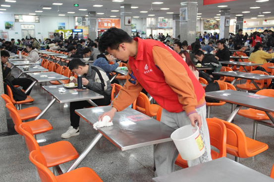餐厅志愿服务活动,主要工作是对餐桌的清理。志愿者们两人一组,认真清理使用过的餐桌,他们通过实际行动改善用餐环境,以服务精神感染同学们,促进文明用餐风气形成,切实减轻餐厅工作人员负担。