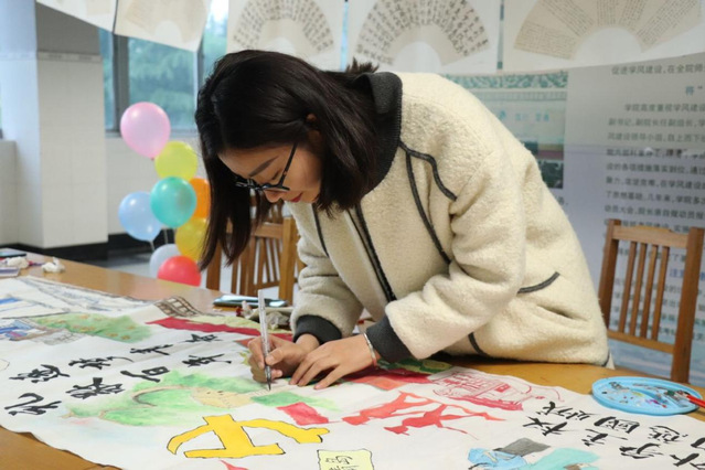 中。同时,现场参观的同学们也纷纷地参与到创作的过程中,一同于书画中感受党的百