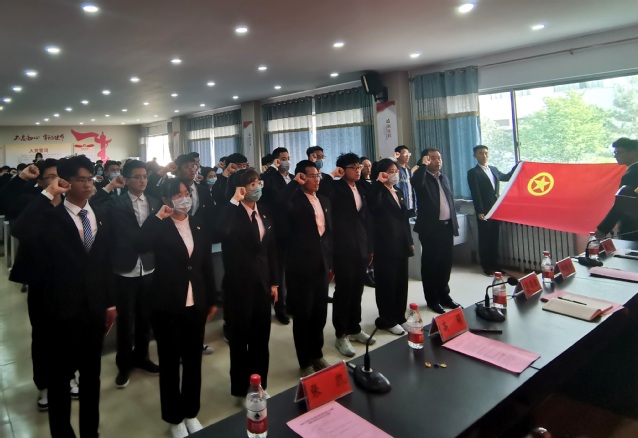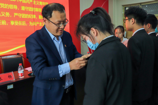 颁奖环节结束后,举行2021年度学院新发展团员入团仪式。与会领导老师为12名新发展团员佩戴团徽、颁发《中国共产主义青年团章程》,团总支书记高萌带领宣誓,新老团员面向团旗,紧握右拳庄严宣誓。能动2001班陶认知代表新团员发言,表示将以入团为新起点,刻苦学习,努力奋斗,发挥先锋模范作用,用实际行动践行入团誓言。