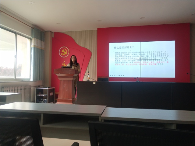 5月10日,我院于12号教学楼217教室举办2021年大学生志愿服务西部计划宣讲会暨2021年大学生应征入伍宣讲会。此次宣讲会由学院辅导员老师周燕燕主讲,2017级班级就业信息员、宿舍长以及有意向参加西部计划项目和预征入伍的同学参加。