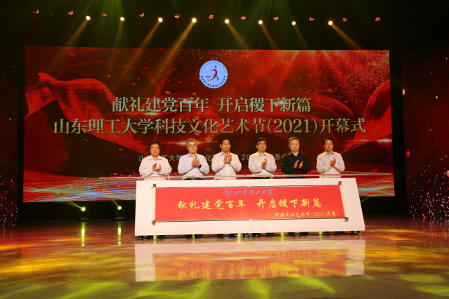 与会校领导推动启动杆,“献礼建党百年 开启稷下新篇”卷轴缓缓展开,代表着2021年科技文化艺术节正式开幕。