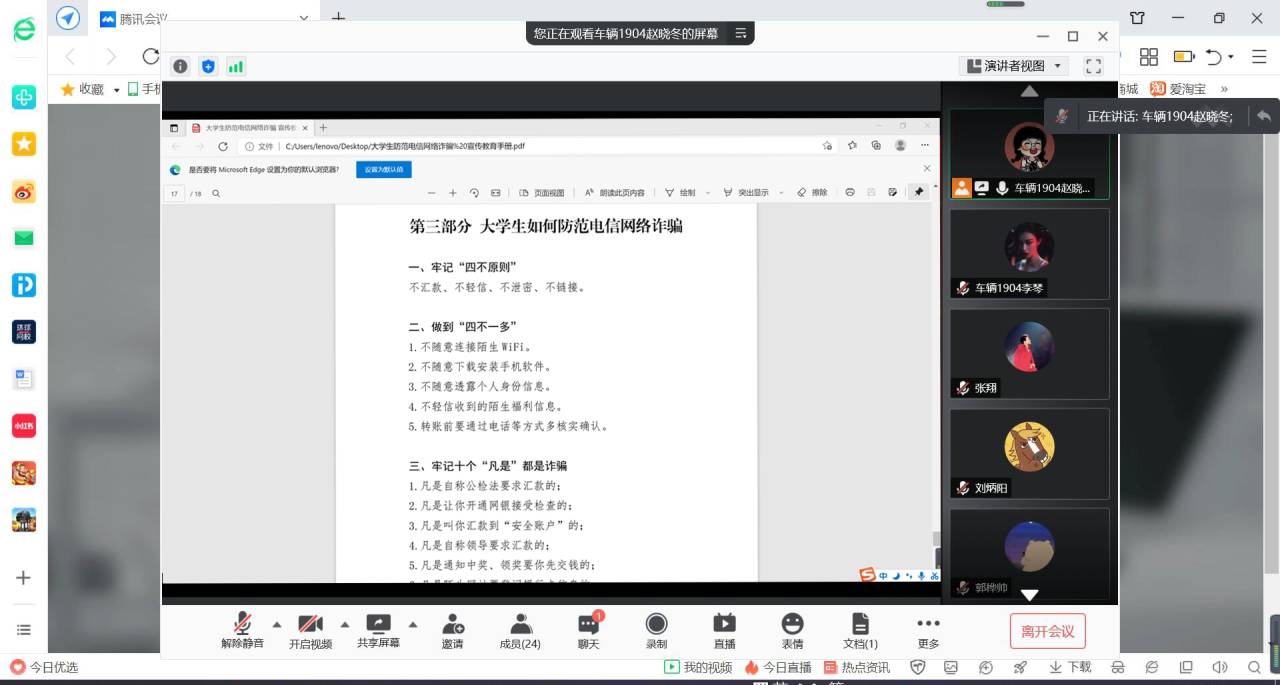 本次主题班会以班级为单位召开,各班级通过线上、线下相结合的方式积极组织学生学习《大学生防范电信网络诈骗宣传教育手册》并签署了《“防范电信网络诈骗 共建和谐平安校园”倡议书》。此外,大家还通过学习相关知识、观看典型案例、参与知识答题等,不断提高安全防范意识。