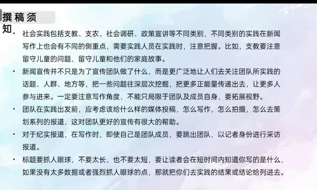 2020年“圆梦”社会实践团队优秀代表施东凌对新闻投稿方面经验进行了分享,他指出社会实践宣传方面主要包括文案、图片、视频三部分,想取得好成绩,新闻的撰写是关键,每篇新闻都需要不断的打磨,一遍遍的更改最终才能定稿。