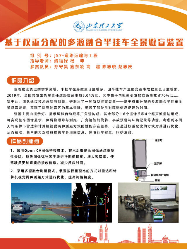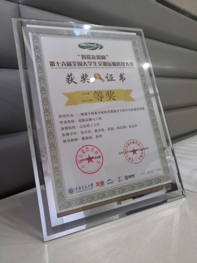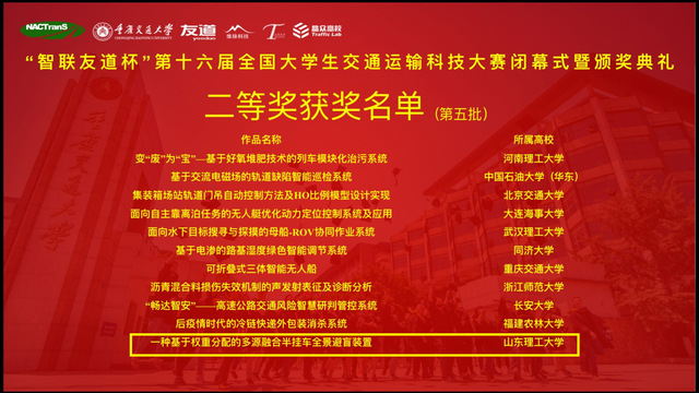 7月25日,“智联友道杯”第十六届全国大学生交通运输科技大赛决赛在重庆交通大学学术交流中心圆满落幕。我院2件参赛作品“一种基于权重分配的多源融合半挂车全景避盲系统”和“智慧环卫无人清扫车”从170所高校提交的1130件参赛作品中脱颖而出,分别荣获国家级二等奖和优胜奖。