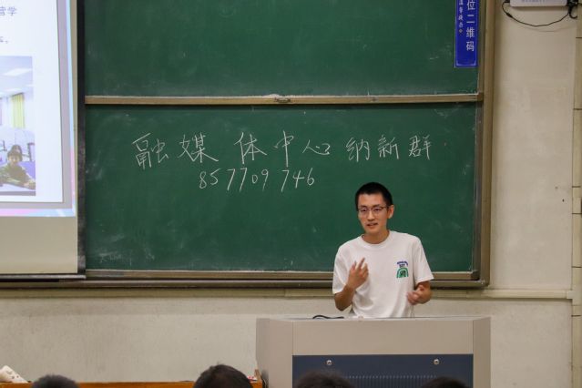 融媒体中心各部门的工作人员结合PPT对各部门的职责及工作流程进行详细的介绍,新生通过宣讲了解各部门的风采。宣讲中讲到,新生们可以在融媒体学到摄影、剪辑视频、新闻撰写等专业技能。在各部门宣讲过程中,新生通过扫描二维码的方式加入纳新群并关注公众号,相关工作人员进行申请表的分发及礼品的发放。