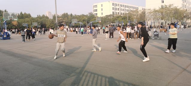 在篮球比赛中,本着友谊第一比赛第二的原则,三个班级的同学混合组队,比赛从一开始便竞争激烈,双方队员你争我抢,投篮、抢断、抢篮板等等精彩对抗,队员之间传球默契、完美配合,两队比分始终不分伯仲。