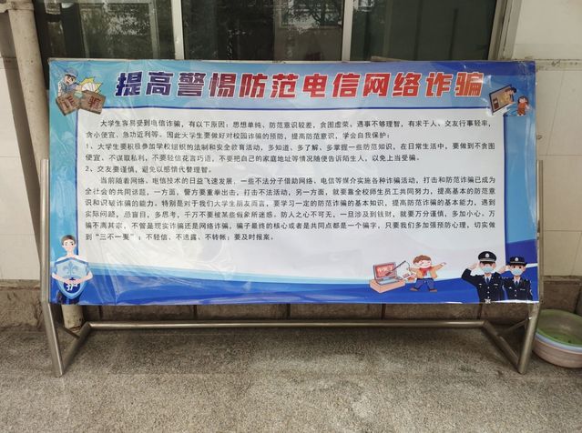 10月21日下午,为提高学生防电信诈骗的意识和能力,警惕校园诈骗,守护美好生活。我院生活服务部同学在9号公寓楼集中开展防电信诈骗活动,制作防电信诈骗宣传展板。