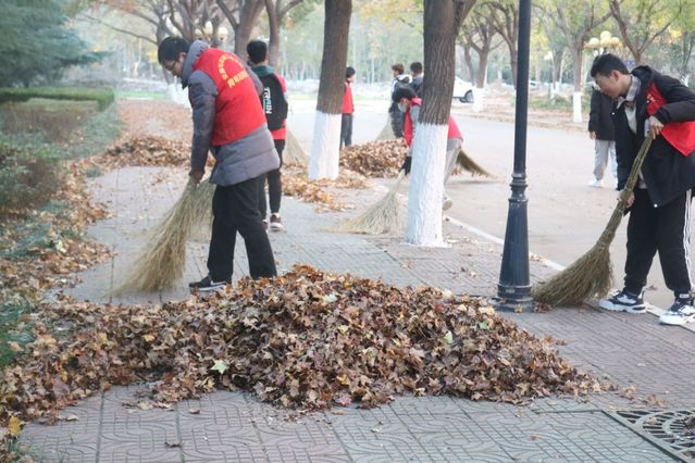 下午4时,同学们准时到达集合,由工作人员领取了志愿者马甲与打扫工具,并安排相应任务。尽管落叶铺满了整条道路,但同学们依旧充满热忱。志愿者们分成若干个小组,迅速展开扫落叶的活动。