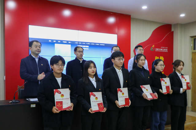与会老师为2021级团支部书记发放《中国共产主义青年团团章》和《交通学院团支部特色成长手册》。