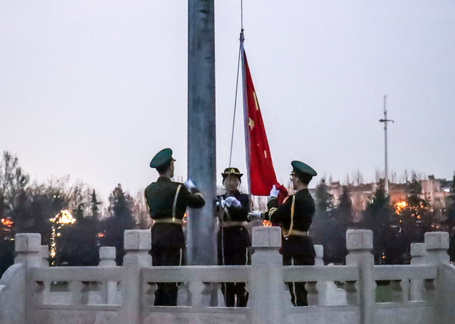 6时30分许,学校国旗护卫队护送着鲜艳的五星红旗,迈着矫健的步伐走上国旗台,在义勇军进行曲雄壮、悠扬的旋律中,现场师生怀着对新一周的憧憬和向往,面向国旗齐唱国歌,注目五星红旗冉冉升起。