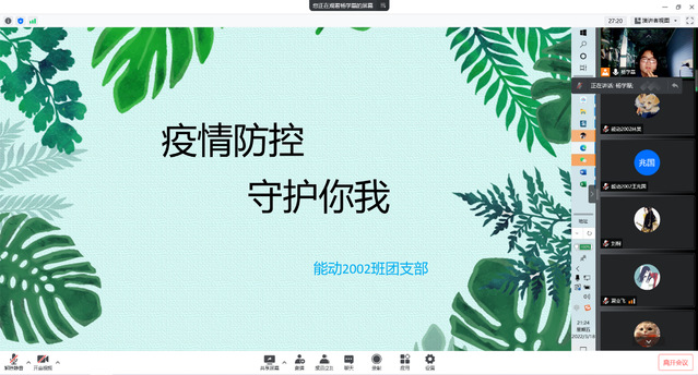 3月18日晚,根据williamhill威廉希尔工作安排,能动2002班举行线上“疫情防控 守护你我”主题会议。此次会议由团支书杨学磊主持,班级全体成员参加。