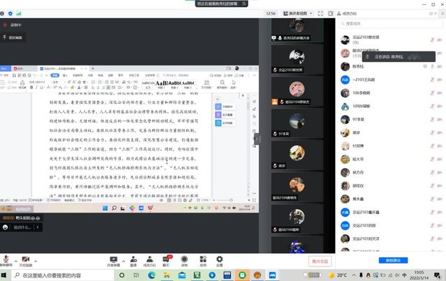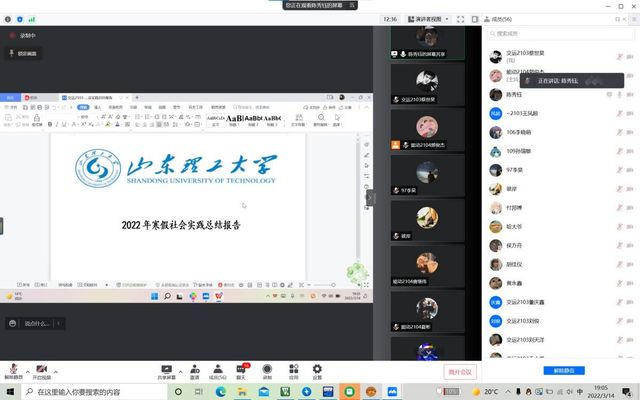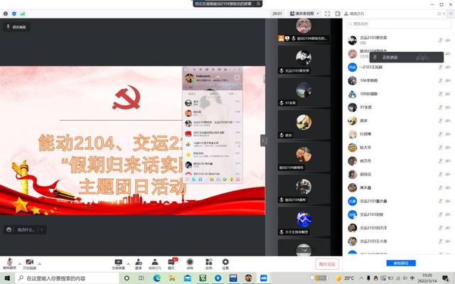 3月14日晚,我班交运2103班与能动2104班联合开展了线上“寒假归来话实践”活动。在同学们的积极参加下,会议由两班团支书相互配合,共同主持,顺利完成。