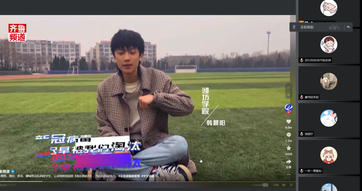 会议从防控指南、如何防控、同心抗疫三个部分展开。会议强调了保持好个人卫生、环境清洁以及营养均衡在疫情防控中的重要性,积极响应学院工作安排,自觉落实常态化疫情防控措施,严格遵守学校疫情防控期间制度管理通知,共同维护安全、平稳、健康的校园环境。在会议中,团支书王萌带领大家观看由山东各大高校学生云录制原创说唱《就是那道光》,为山东抗疫助力,致敬奋斗在抗疫一线的工作者们。