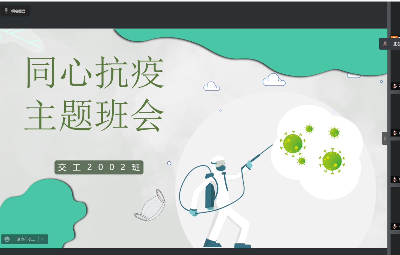 3月21日晚八点,交工2002班线上召开同心抗疫主题班会。此次班会由交工2002班团支书王萌主持,全体同学参加。