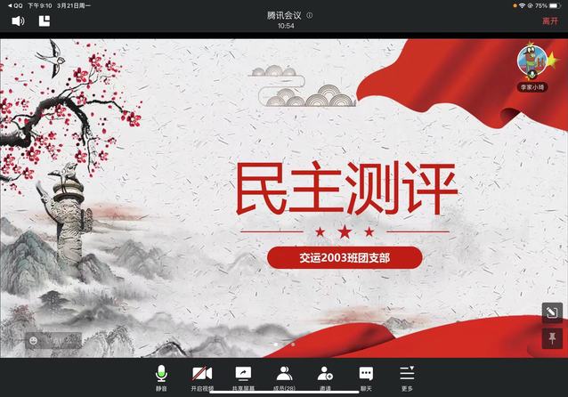 为增强班内同学的疫情防控意识,积极响应学校和学院疫情防控工作的安排,同时完成班内入党积极分子的民主测评,我院交运2003班于3月21日召开疫情防控及班级民主测评主题班会。按照学校疫情防控要求,此次班会线上召开,班会由交运2003班团支书鲍瑞雪主持,交运2003班全体同学共同参加。