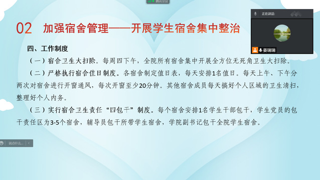 此次会议围绕宿舍卫生要求、宿舍卫生打扫工作制度、学校宿舍卫生整治规定三个方面开展。