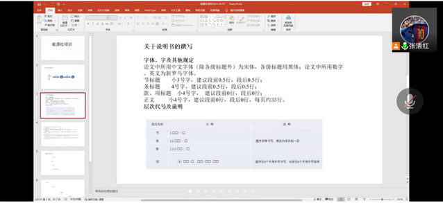 张清红对同学们有关参加节能减排大赛过程出现的问题进行解答,详细讲解了节能减排大赛的校赛的相关安排。要求同学们进一步明确需要提交的资料并尽早做好准备。会议中,张清红为同学们就说明书的撰写,字体及排版等问题提出要求,张清红说,说明书中应该包含项目的产生背景,原理,运行过程及其产生的节能减排效益等内容,从而使同学们提交的作品格式更符合大赛标准。在参赛PPT需要展示的内容方面,也提出了严格的要求,张清红重点强调在制作PPT的过程中要严格做到“分清主次、突出重点、区分颜色、避免堆积”这十六字箴言,通过对样式和内容的要求,使参赛组在PPT制作方面有章可循。张清红在培训结束后不忘与同学们进行互动交流,尽管采用线上形式,同学们依旧踊跃提问,张清红耐心讲解,以保证疑难问题得到最大程度的解答。